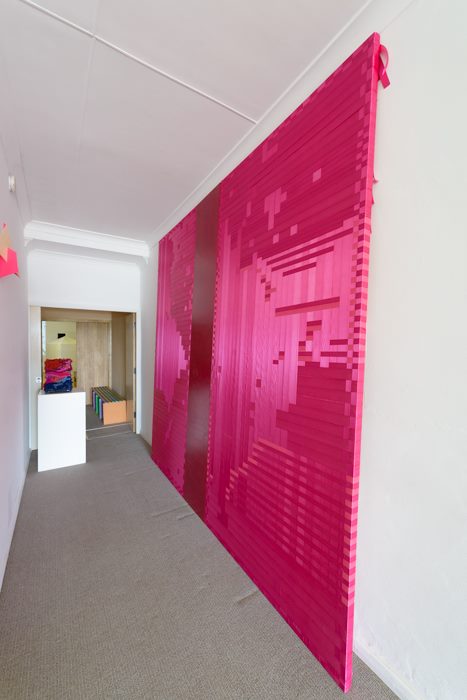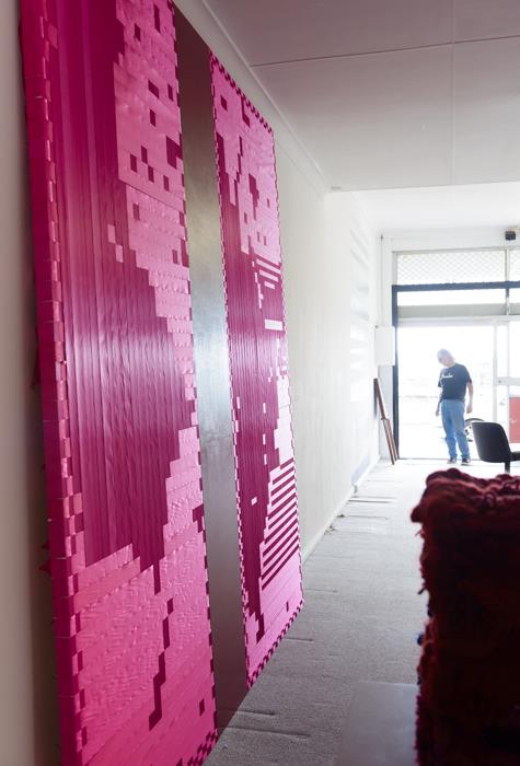In this work the codified pattern of eight drops of blood falling from one metre onto a hard surface is further coded into a weaving pattern, using satin ribbons and solid canvas. Through variations of the dyed colour magenta and the reflective properties of the satin weave in the ribbon, the work responds to the position of the viewer relative to the angle of light as a photonic device. In addition the location of the work in the gallery space exposes the sideways view of the work to the casual passing viewer in the corridor. Magenta as a name for a colour has been linked with war and bloodshed since the name of the aniline dyestuff Fuchsine was changed in 1859 to magenta to celebrate the French victory at the battle of Magenta in northern Italy. photo credit; Henry Rust