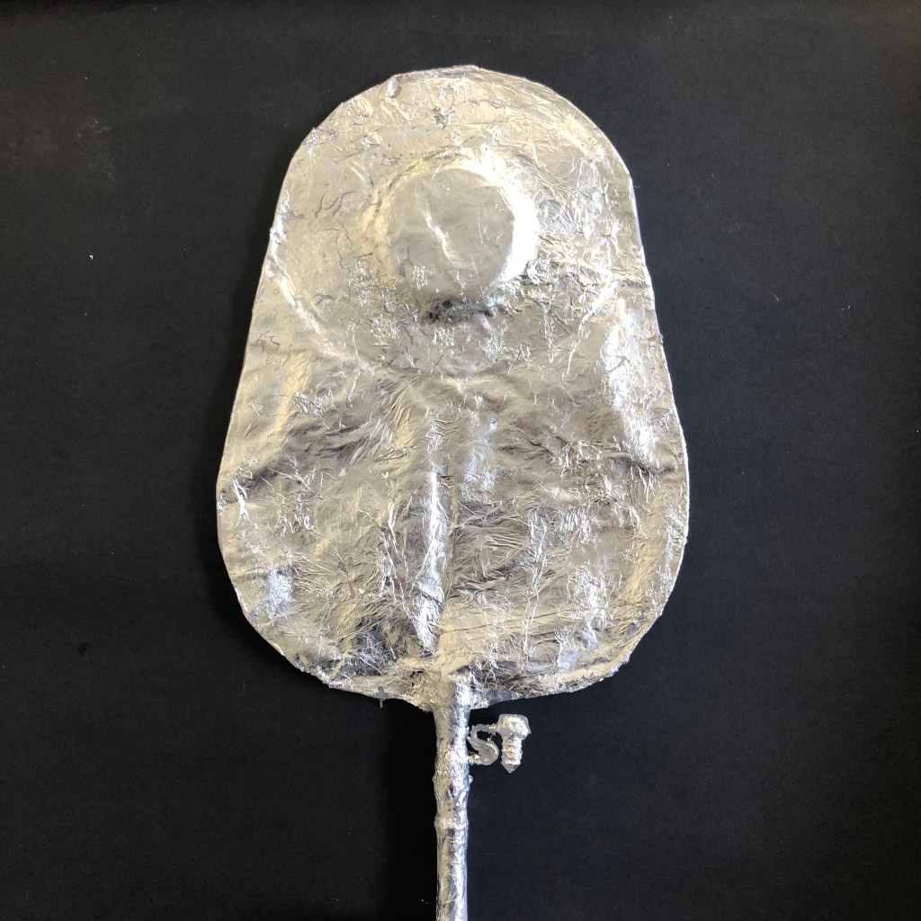 The most important connection of these two devices is the one to the human body. Then the urostomy bag is stuck without much finesse to the skin of the stomach surrounding the stoma. This connection is not in this work. It is off stage It can’t be seen as in use the urostomy bag conceals it from view. It is always private.