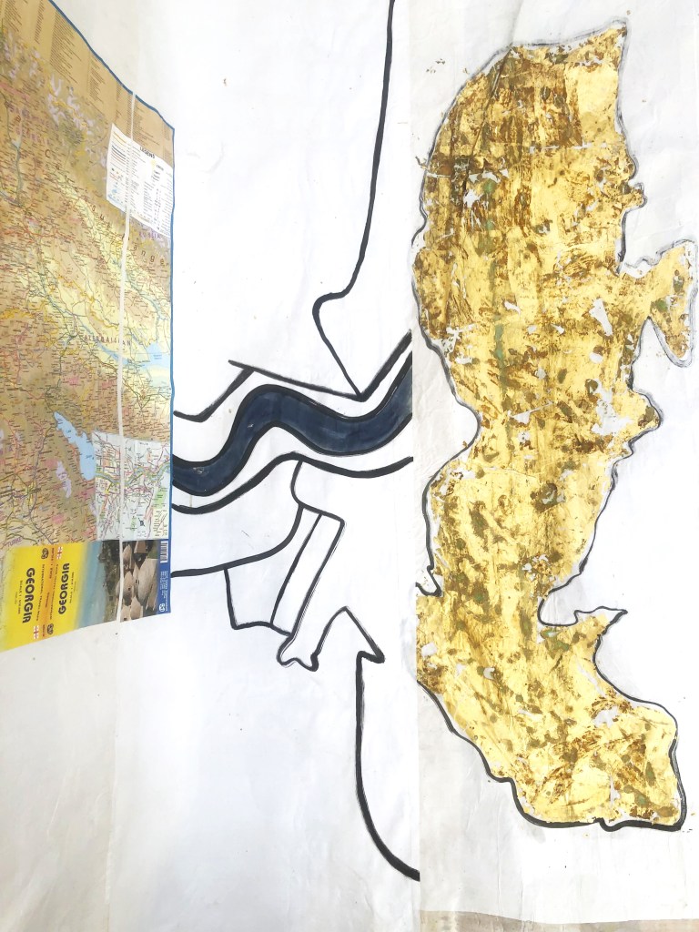 rice and other papers, gold leaf, wood, paint, silk paper and cloth, 2014 and 2023 1800 x 30 x 30cm in rolled format 1800 x 10200 x 30