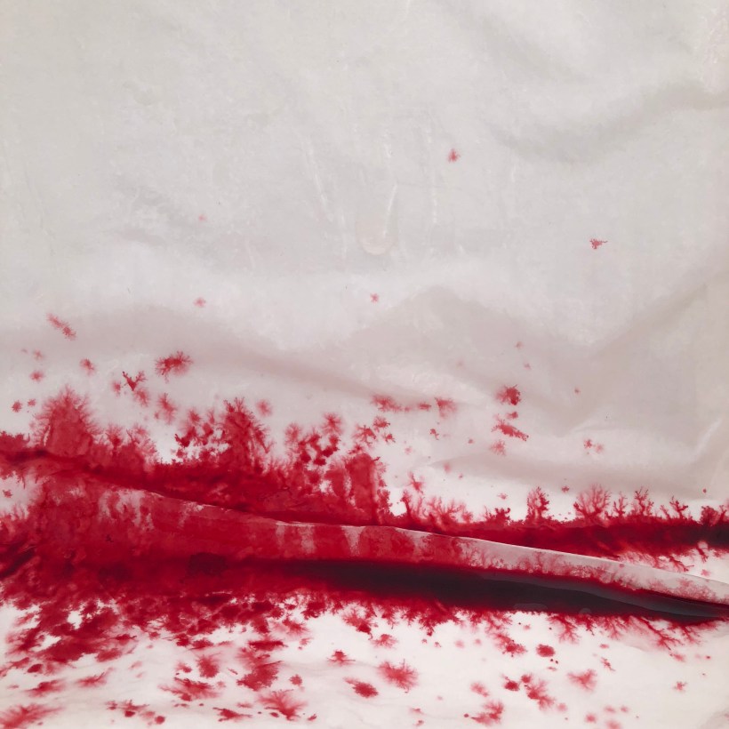 Video still from a new work Blood on Silk: Blood Running, 2018. The video will be projected onto the surface of a wondercabinet zinc box set on the top of a table. Part of the video of the running blood will occasionally extend onto the floor.