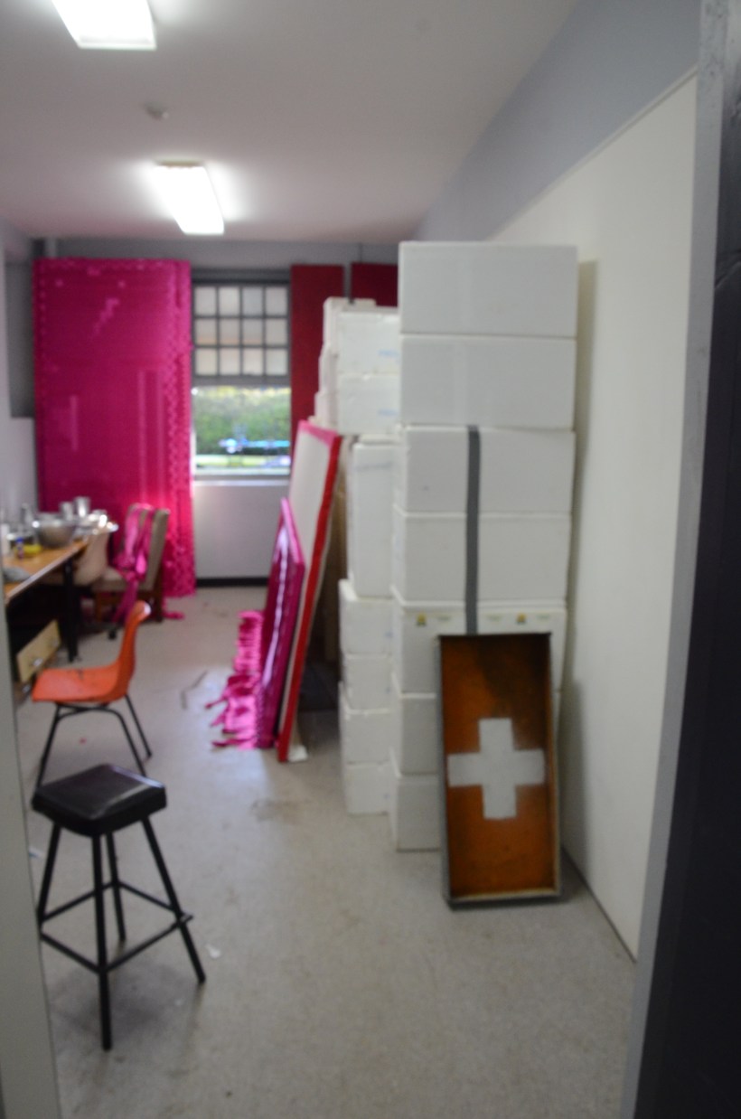 Studio Shot – White blood work in front of red blood work in front of magenta blood weavings